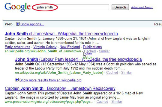 To prove how different the search results can vary depending on which Google country search engine is used, try typing in a common name like [john smith] in two different Google country search sites and then compare the results, as shown below.